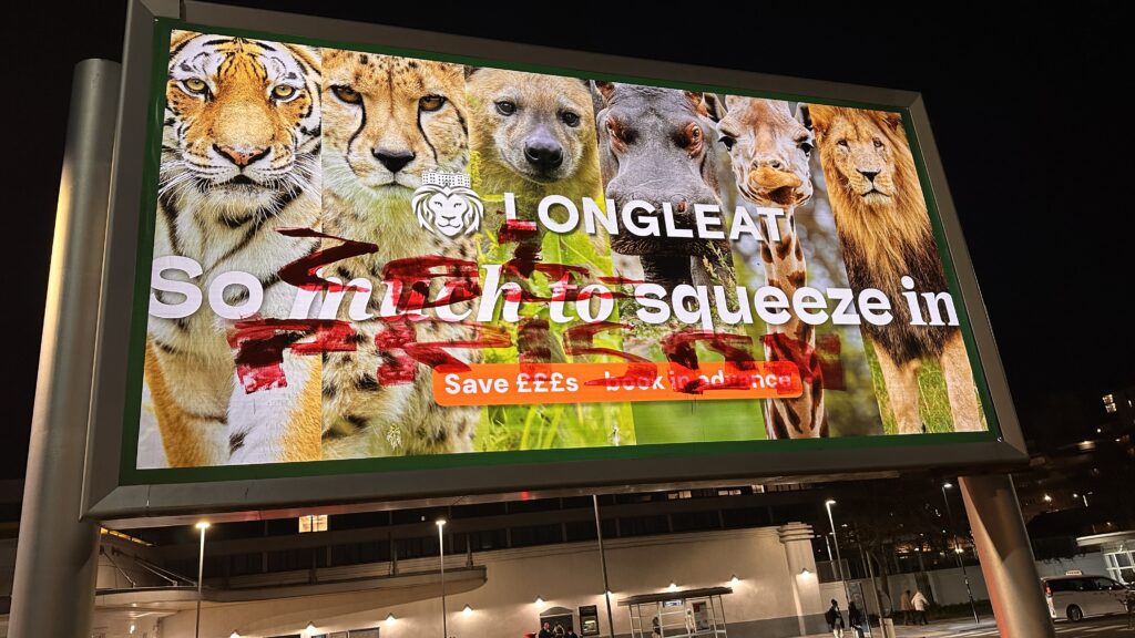 While friends were socialising, I painted two billboards in Southampton advertising a local zoo with ‘ZOO = PRISON’. I know this was a small act, but this was my first direct action for animal liberation. It won’t be my last.