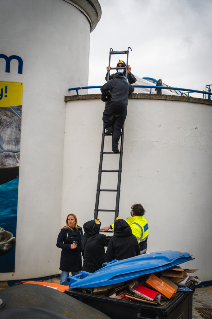 This month has seen a flurry of action across the UK. In Scotland, actions against the horrific Guga Hunt on the Isle of Lewis in Scotland have continued to intensify. Every year, 2,000 gannet chicks are clubbed to death in a practice illegal everywhere else in the UK. With a petition of over 100,000 signatures due to be debated in the next parliament, two campaigners scaled the roof of NatureScot, which licences the hunt, wearing gannet costumes and chaining themselves to chimney stacks. They remained up there for three days before being removed by the police. Last month, NatureScot had its windows smashed and walls painted.