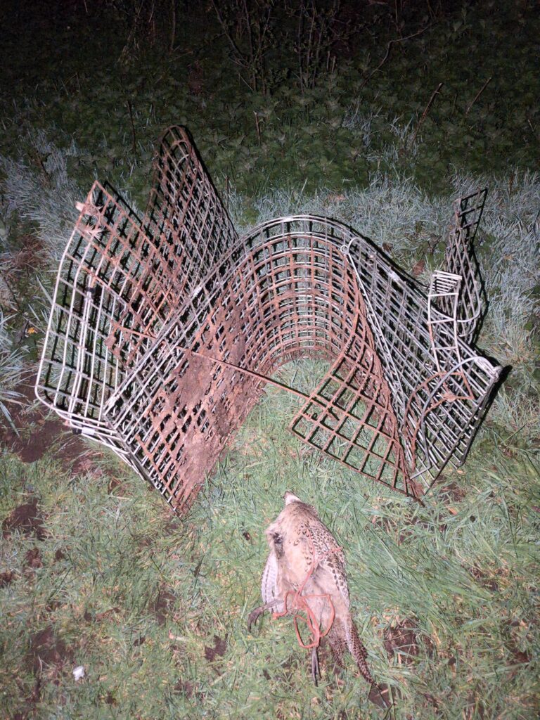 “Large mammal trap baited with a dead bird found while having a nosey around a farm. Most likely intended to trap a fox.