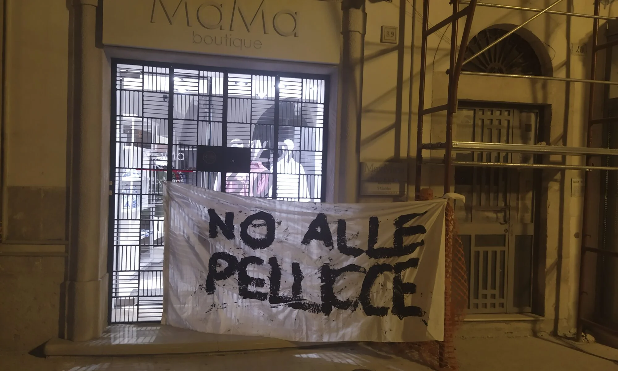 “Banner with painted writing “No alle pellicce – No to fur” hung and tied in front of the Max Mara store MaMa (https://www.instagram.com/mama_boutiquefg/) in Piazza Umberto Giordano square.