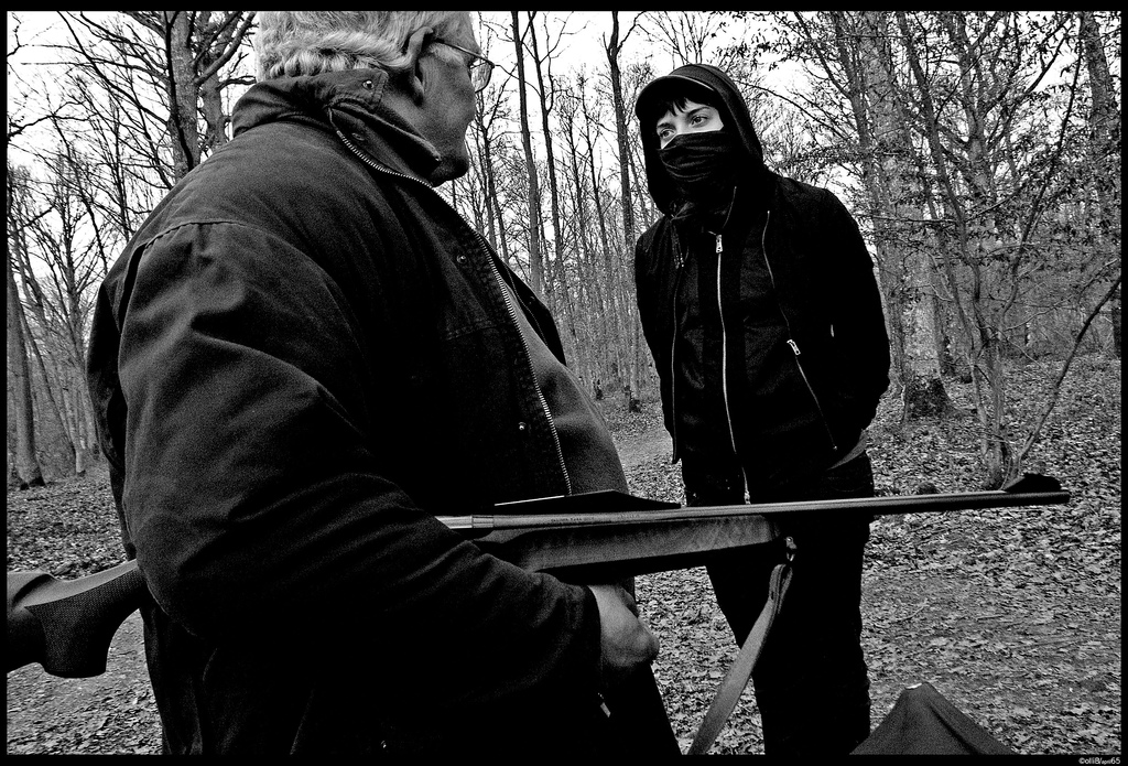 Photo of a hunt sab confronting a hunterLiked it? Take a second to support Unoffensive Animal on Patreon!